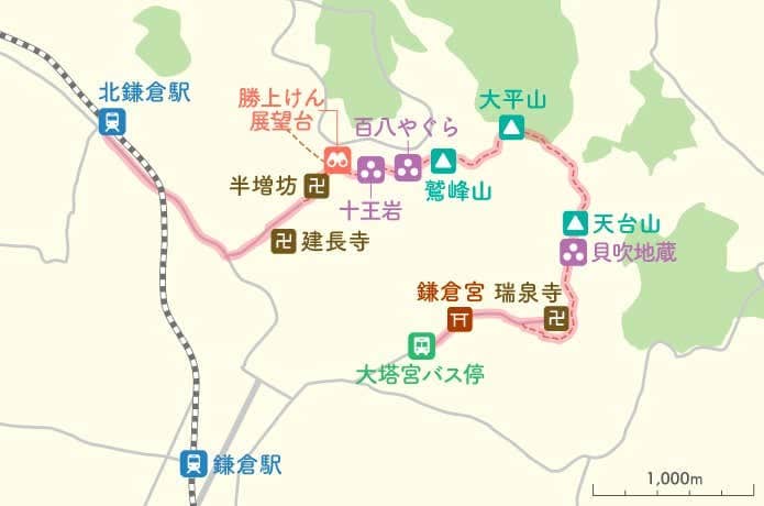 北鎌倉駅(1km・19分) → 建長寺入口(0.8km・19分) → 半増坊(0.3km・17分) → 十王岩(0.6km・15分) → 鷲峰山(0.7km・20分) → 大平山(1.2km・25分) → 天園ハイキングコース入口(0.2km・7分) → 瑞泉寺(1km・17分) → 鎌倉宮(0.2km・4分) → 大塔宮バス停