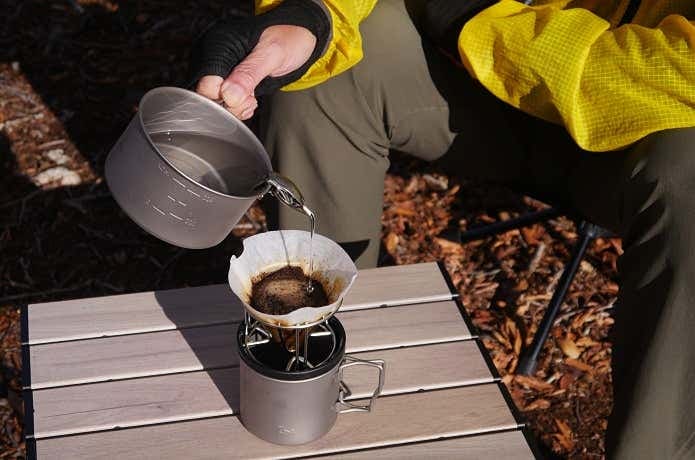 チタニウムワイドマグ450、チタニウムマグ350は、シェラカップ同様に、直火に掛けることができる小型クッカーでもあるので、低温時対応のコーヒードリップを可能にしてくれます。