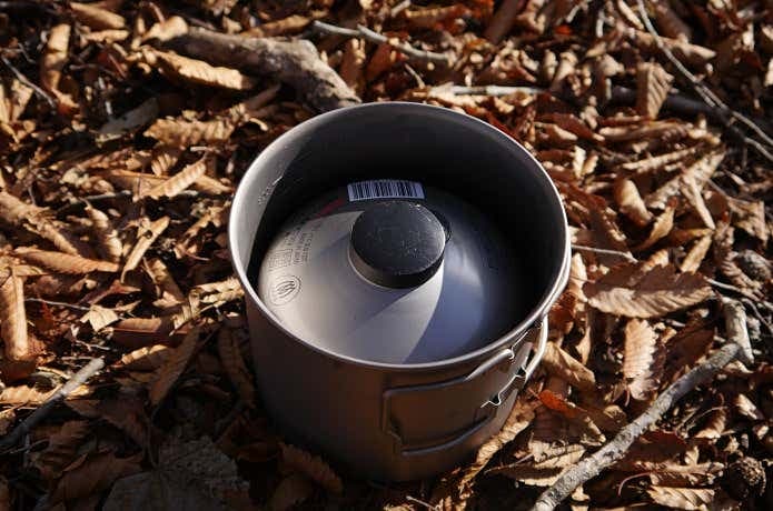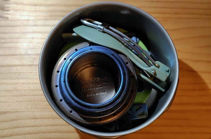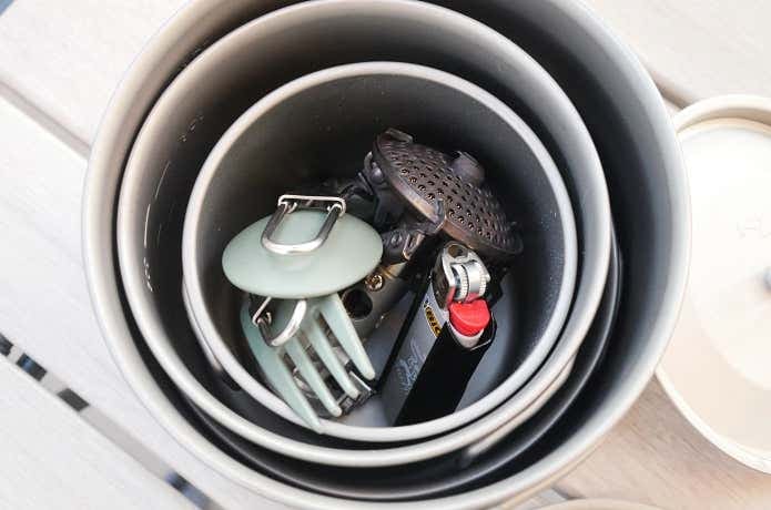 4つのポット&マグをスタッキングした場合、最内は径の小さいトレイルマグ350となるので、110ガス缶は収納できません。代わりに、上画像の通り、ストーブ本体、ライター、折り畳みカトラリーを収納できました。
