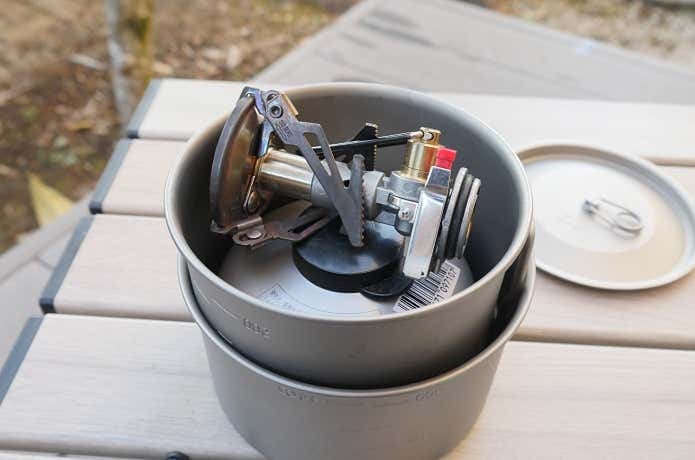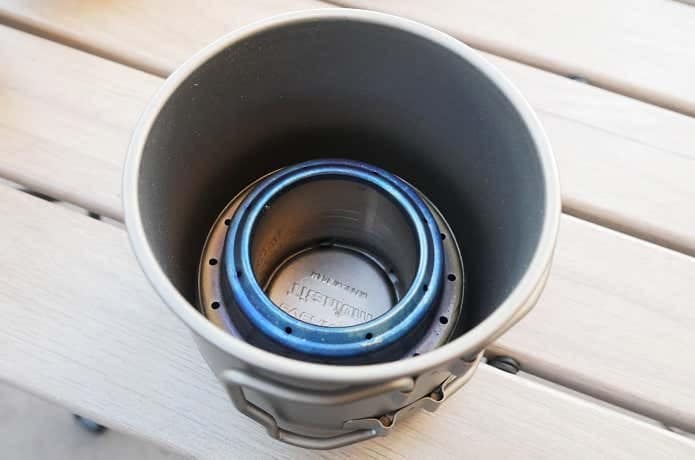 最内に入るチタニウムマグ350は、トランギアの「アルコールバーナー」やエバニューの「Ti アルコールストーブ」を入れられるサイズです。