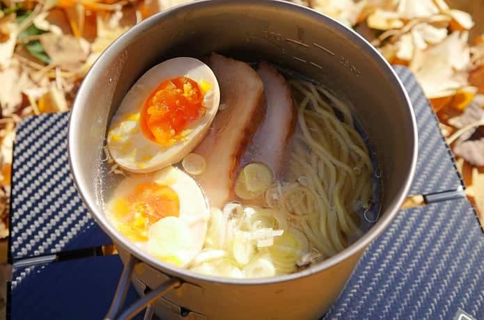 ラーメンをつくったクッカーで、スープを直飲み&手持ち可能なのは驚き!