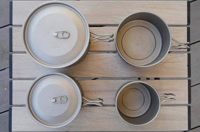いずれも焦げ付き防止加工はなく、熱伝導の低いチタン製なので、調理には不向きです。湯沸かしがメインとなりますが、軽さとスタッキング性をよしとする一般的なタテ型チタンクッカーとは異なる特長があります。