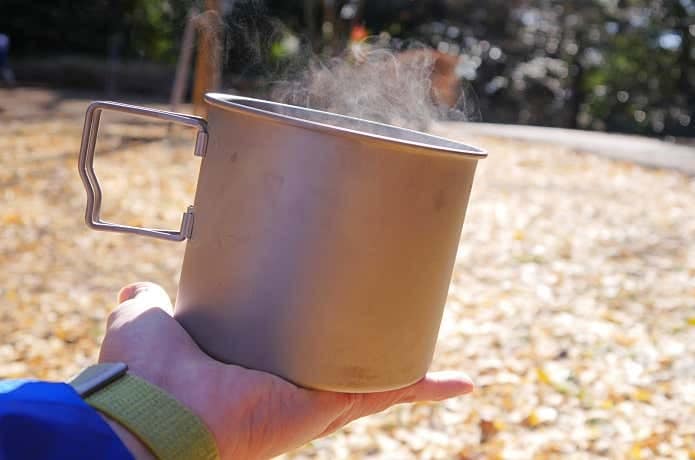 熱伝導率の高いアルミ製のシェラカップやクッカーで湯沸かしして、スープやインスタントラーメンを食べる際、しばらくしてもクッカー自体が熱くて、唇を付けることはできません。それは0.3mm厚のチタン製クッカーも、ほぼ同じ。