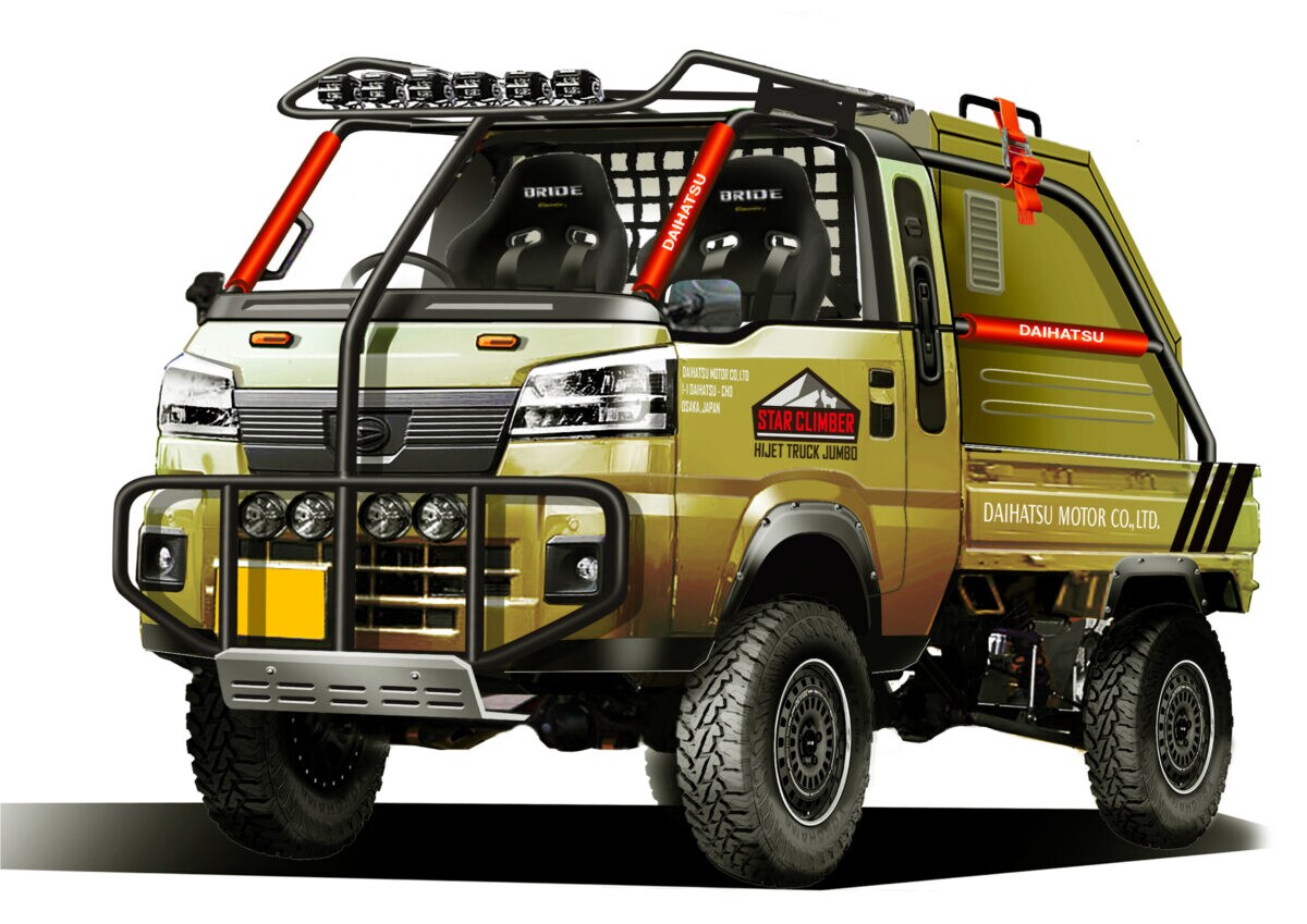 「軽トラ対決」のためダイハツがプロデュースしたカスタマイズカー。「ハイゼット トラック ジャンボ」の駆動力、登坂力を向上させ荷箱を追加することで、仕事から趣味、災害支援でも活躍できるモデルです。