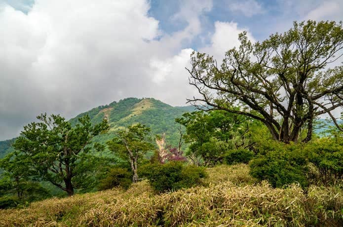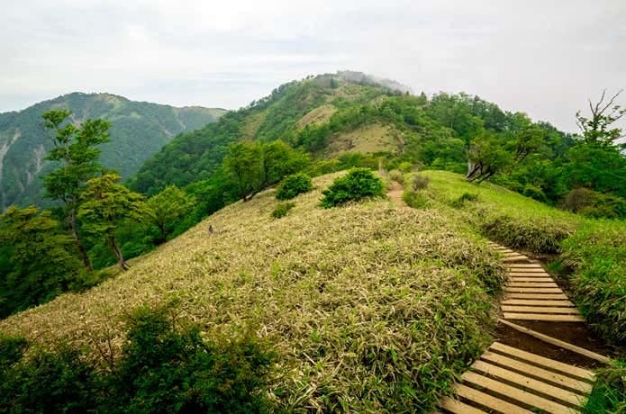 その名の由来が「雨木」といわれるように、豊かな樹林帯に包まれた緑深い山域です。稜線にはブナの原生林が広がり、堂々としたブナの大木に出会えることも特徴。万二郎岳と万三郎岳をめぐる周回コースは約4時間半で歩け、人気の高いルートとなっています。