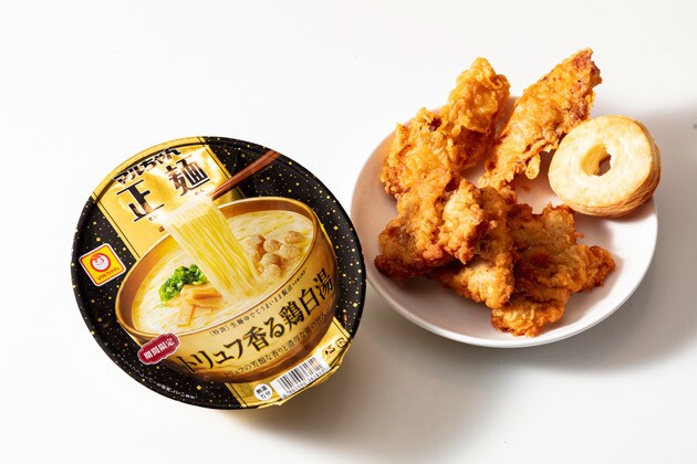 野島 チキンの脂や肉汁だけでなく、スパイスも浸透して抜群においしくなるんです。衣をほぐしつつ食べ進め、濃くなりすぎたらお湯を足す。味の調整が簡単なのもポイントです。ちなみにモスチキンやファミチキなどでもいい感じになりますよ。