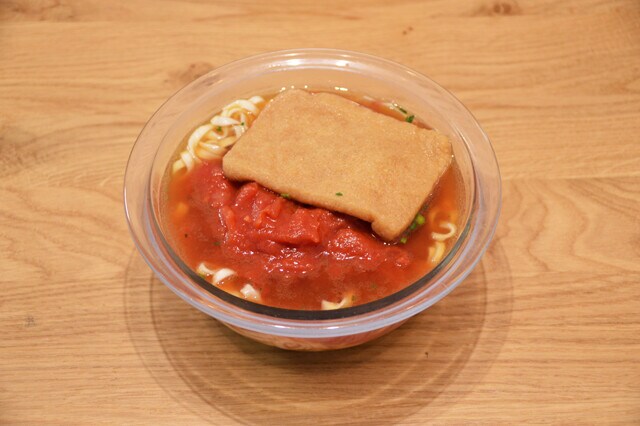 どん兵衛にトマト缶200gを加え、さらに野菜とカレースパイスを混ぜる。スパイシーなトマトカレー煮込みうどんといった風合いで激ウマだが、これをどん兵衛の乾麺にぶっかけて食べることに。麺で麺を食らう真性バカレシピだ!