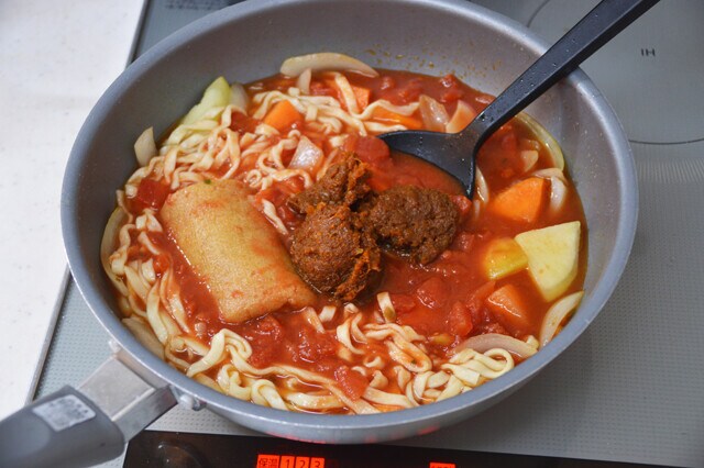 野島 普通のカップ麺だと麺がデロンデロンに伸びてしまいますが、どん兵衛なら調理時間が長引いても大丈夫。かなり考えられていますね。鍋で野菜を炒めたらレンチンを終えたどん兵衛+トマト缶を投入し、カレースパイスを混ぜます。うおっ、めっちゃいい香りがしてきたぞ!