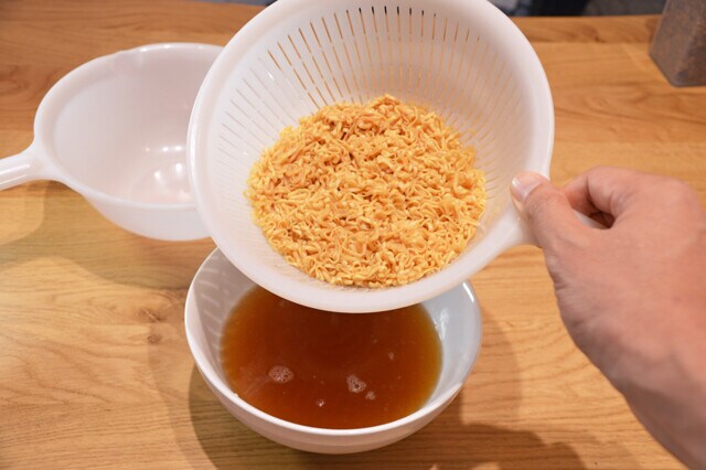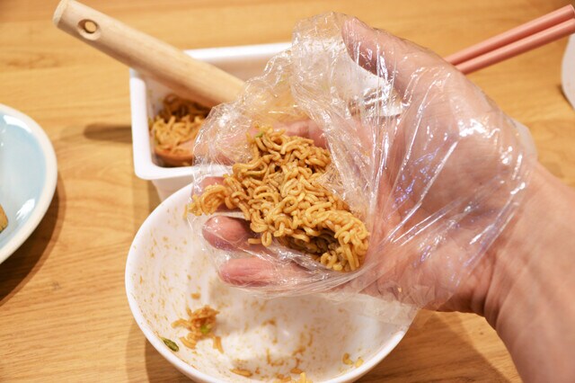 野島 手順どおりにペヤングを作った後、麺を手で握り潰してみます。グニグニーッ!