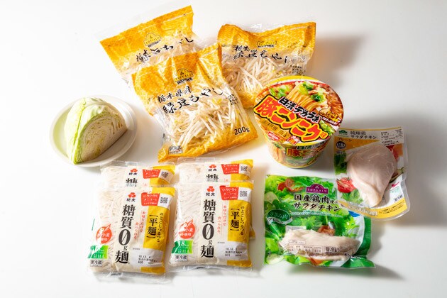 日清デカうま 豚ニンニク味のスープ(46kcal)/紀文 糖質0g麺 4袋(72kcal)/サラダチキン 2個(190kcal)/モヤシ 3袋(100kcal)/キャベツ 100g(22kcal)/ニンニク 3かけ(20kcal)