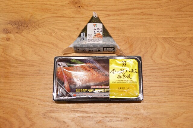 野島 さあ、どんどんいきますよ。最近話題になった明太子おむすび風にアレンジした「黄金鮭ハラミのおむすび」はどうでしょ。スライスした金の鮭ハラミ西京焼を鮭おにぎりにラップで巻いて握り、強引に一体化させました。