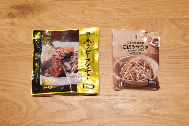 金のビーフシチューから肉を1、2切れ取り出し、ほぐしてごぼうサラダとあえるだけ。残ったシチューはそのまま食べればOK!