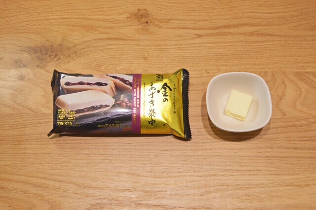 熱したフライパンで金のあずき最中の両面を軽く焼き、焦げ目がついたらバターを添える。塩気と芳醇な風味があずきと完璧マッチ!