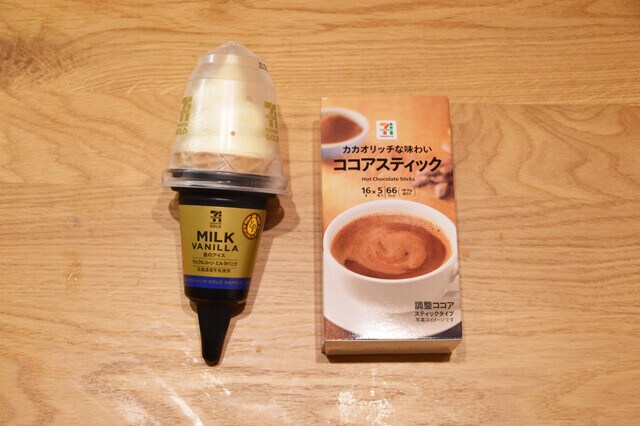 金のアイス ワッフルコーン ミルクバニラにココアスティックを振りかける。コーンとアイスを分けなくてもウマさ最強!