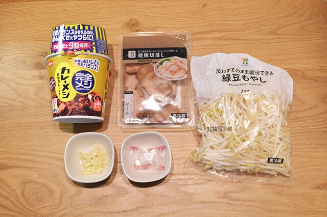 ・日清の完全メシ カレーメシ 欧風カレー ・セブンプレミアム焼豚切り落し ・モヤシ ・チーズ ・牛脂