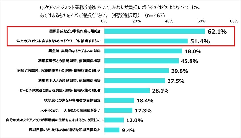 調査は2025年9月17日~9月26日に、「カイポケ・ケアマネドットコム」を利用する在宅介護領域ケアマネジャーを対象に実施、467人が回答した。ケアマネジャーが業務全体で最も負担を感じているのは「書類作成などの事務作業」(62.1%)、そして「法定のプロセスに含まれないシャドウワークに該当するもの」(51.4%)だった。シャドウワークで特に負担を感じていたのは、「利用者の介護に関すること以外の相談対応」(73.0%)で、ほかにも安否確認や介護保険以外の行政上・金融機関の諸手続きなど、利用者本人や家族が行うことが難しい身の回りの対応を、結果的にケアマネジャーが担うことになっている現状がうかがえた。