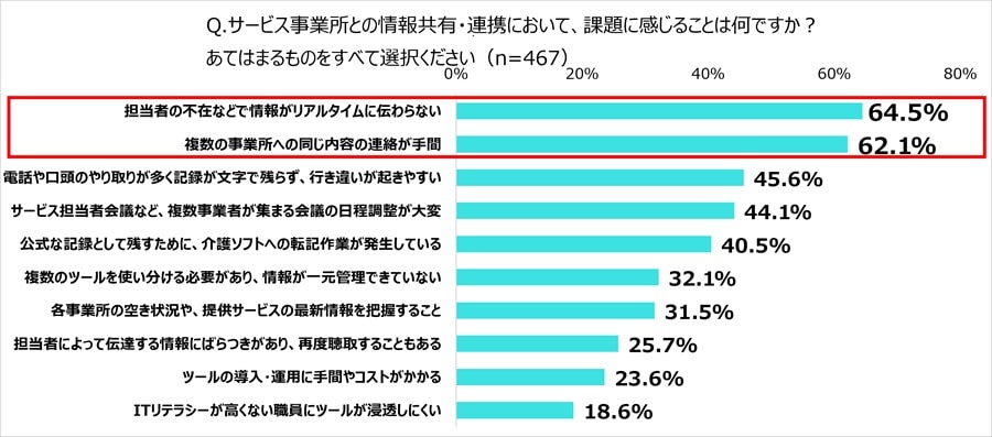サービス事業所との情報共有・連携の課題は「担当者の不在などで情報がリアルタイムに伝わらない」(64.5%)、「複数の事業所への同じ内容の連絡が手間」(62.1%)という声が多く、電話以外の連絡手段で解決できる可能性が示唆されている。