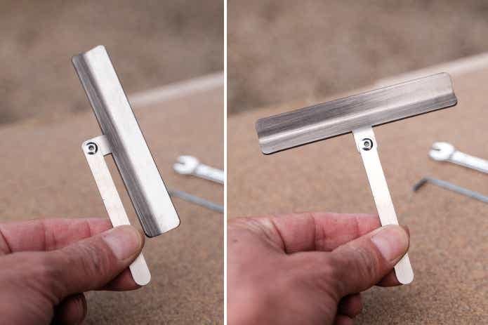 まずはヘラのようなコレ。可変式でコンパクトに持ち運ぶことができ、使用時はT字型にします。
