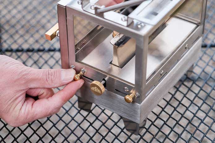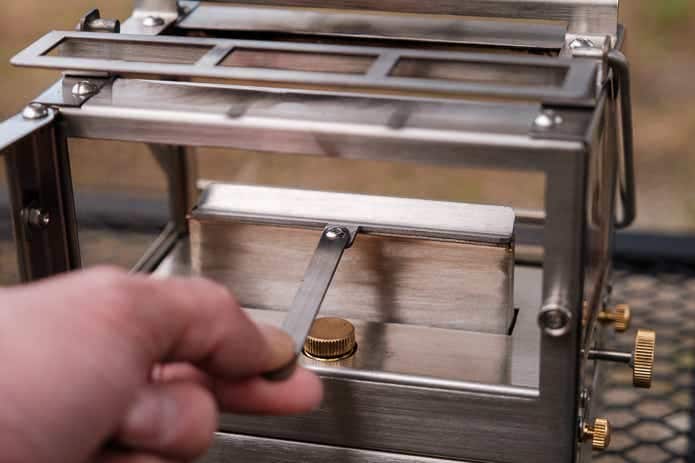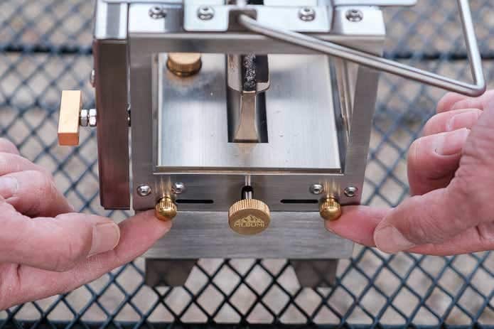 火力調整ノブの両側にある真鍮のネジ、これらは手でも回せるネジです。くるくると回して外すと……。