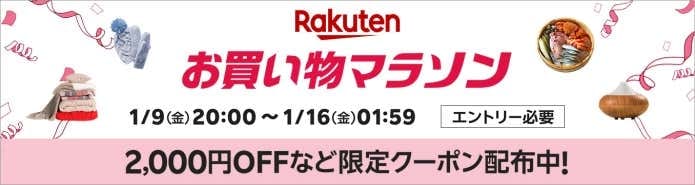 2026年1月9日(金)20:00〜16日(金)01:59まで楽天お買い物マラソンも開催。複数ショップでお買い物するとポイント還元率が最大11倍に!お買い物マラソンへのエントリーもお忘れなく!