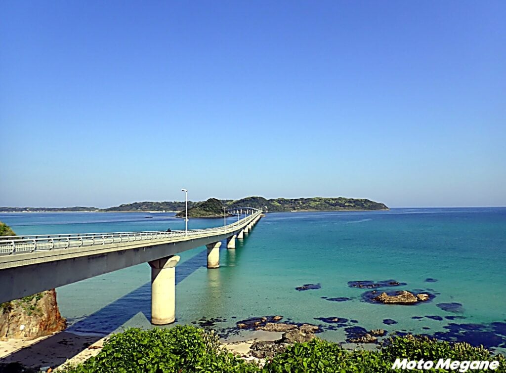 展望テラスからはコバルトブルーの海と角島大橋を一望でき、周辺には角島灯台や古墳など観光スポットも多い。日本海沿いのシーサイドラインを走るツーリングの途中に立ち寄る休憩地として最適で、景色・食・アクセスの三拍子がそろった人気スポットとなっている。