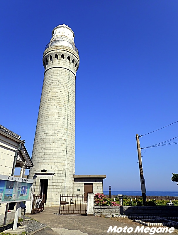 総御影石造りの洋式灯台で高さは29.6m。明治9年に初点灯した日本海側初の洋式灯台で、現在も現役で点灯している。らせん階段で踊り場まで昇ることができ、上からの眺めは抜群。見学には灯台参観寄付金300円が必要。灯台周辺は公園となっている。