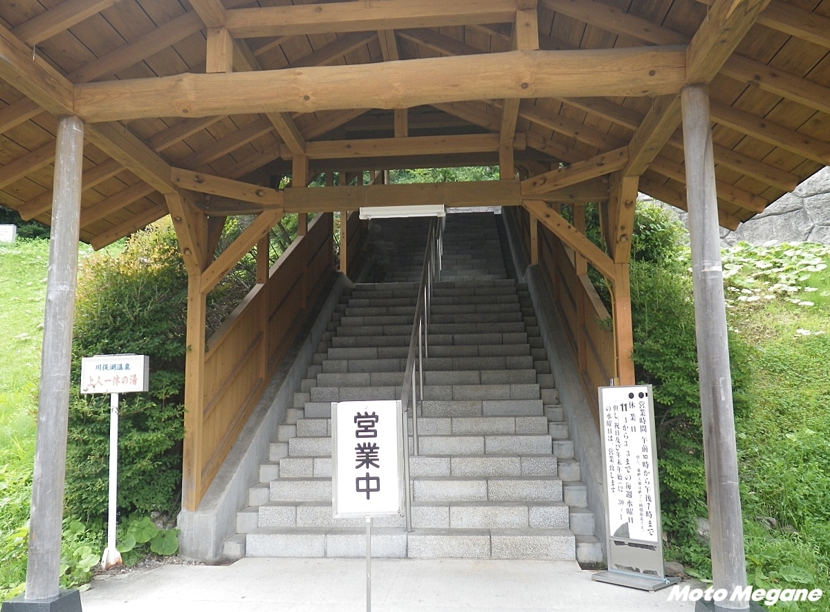 川俣湖温泉共同浴場。pH9.8のアルカリ性単純泉の源泉かけ流し温泉。露天、内湯があり、湯あたりは柔らかく、肌がスベスベになることから「美人の湯」と言われている。営業時間は10:00~18:00、火曜定休、冬季休業。料金は中学生以上700円。