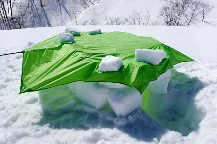 また、雪が融けてしまうような、気温の高い日や雨の日には屋根付きの本格イグルーは作れません。別の方法を考えましょう。