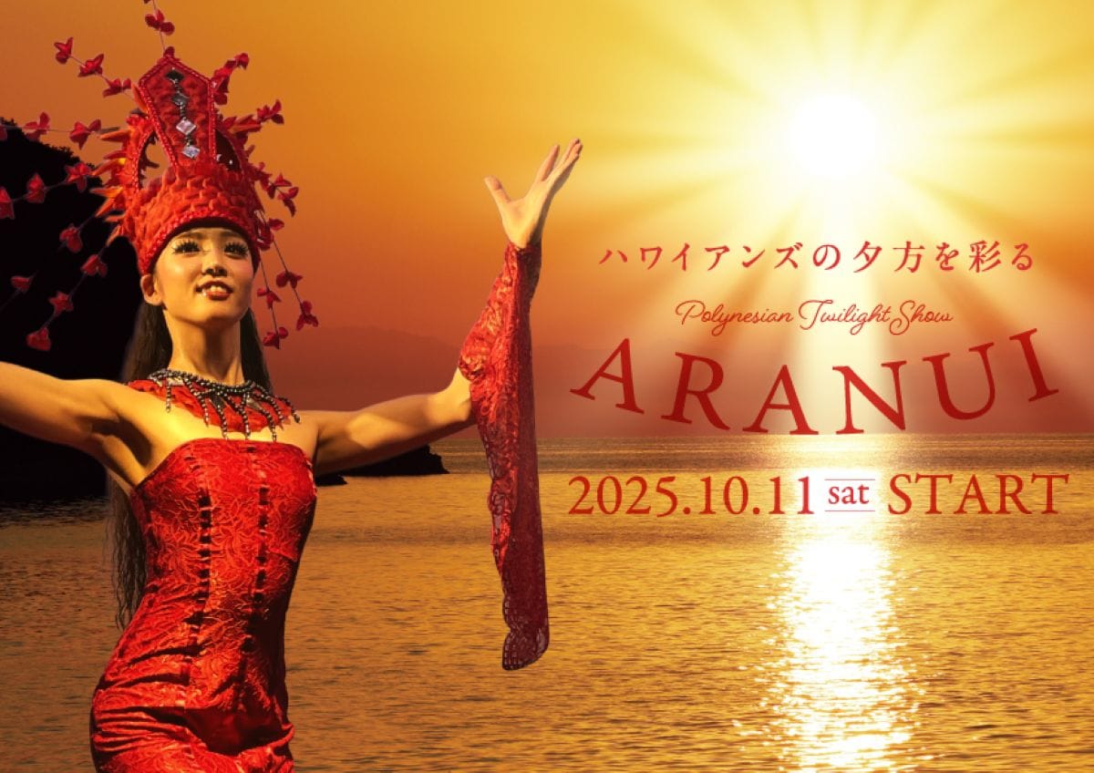 2025年10月11日からは、毎日夕方開催のショーが全面リニューアルされ、「ポリネシアン・トワイライトショー『ARANUI(アラヌイ)』」としてスタートしています。『ARANUI(アラヌイ)』はタヒチ語で「海の道」を意味するそうで、大自然と文化をモチーフに、観る人を南太平洋の世界へと誘うような、タヒチアンダンスを中心とした本格的なステージへと進化しています。このショーは、最大45席(全15卓)の限定空間スプリングパーク「プラザ」で行われます。