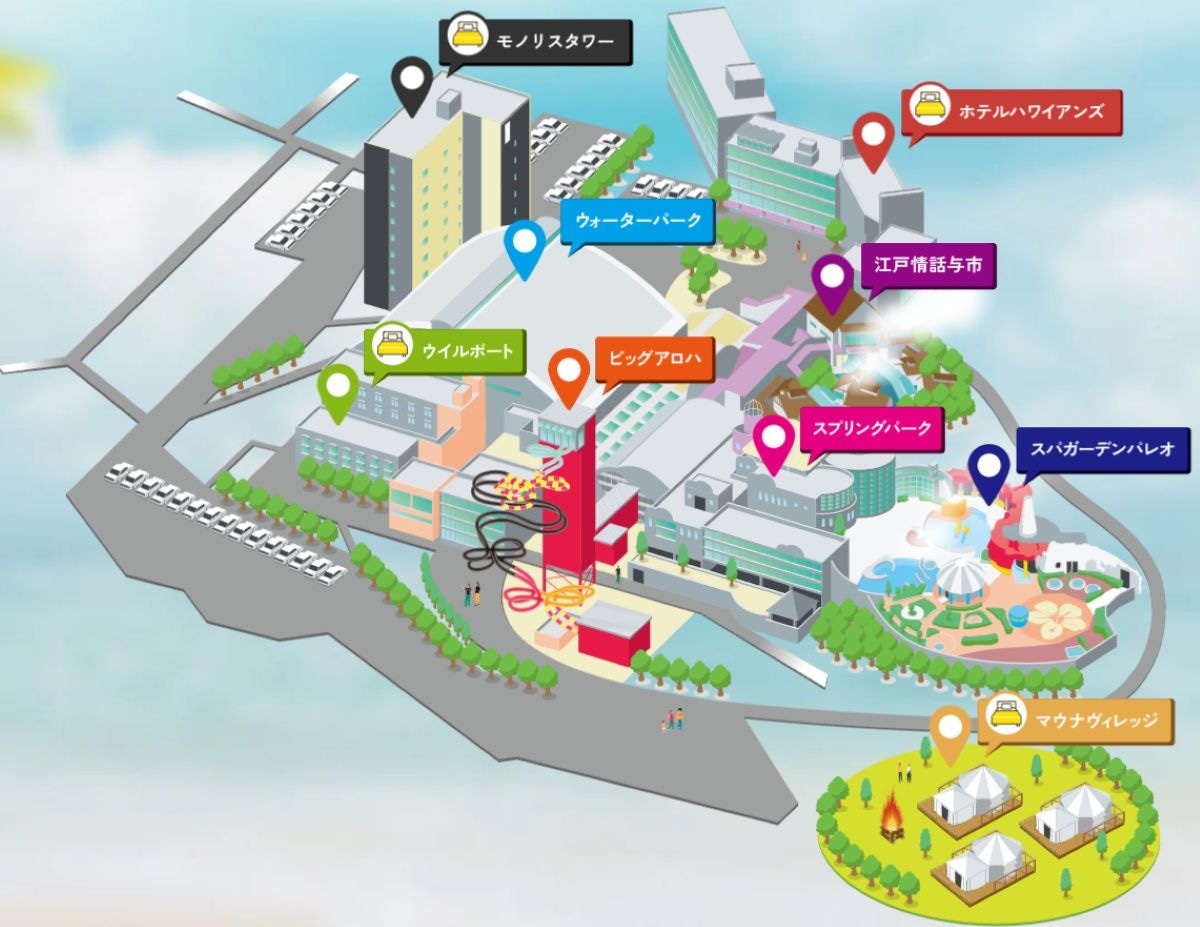 ウォーターパークには流れるプールや小さなお子様が楽しめるようなプール施設も揃い、温泉ゾーンは、入浴も楽しむことができます。フラやタヒチアンダンスの基本を学んだりファイヤーナイフダンスに挑戦したり、ウクレレ演奏やレイ(ハワイの装飾品・首飾り)作りなど、様々な体験プログラムも用意されています(一部は事前予約)。