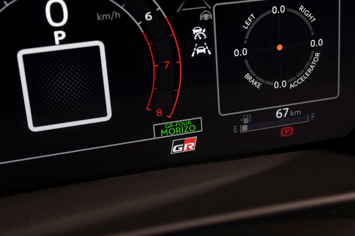 4WDシステムの制御モードも専用で、ベース車に備わる「GRAVEL」モードと置き換えるかたちで「MORIZO」モードを設定。このモードでは、ニュルブルクリンクなどサーキットを安心して走ることができるようにイニシャルトルク、駆動力配分(前50:後50)に固定される。