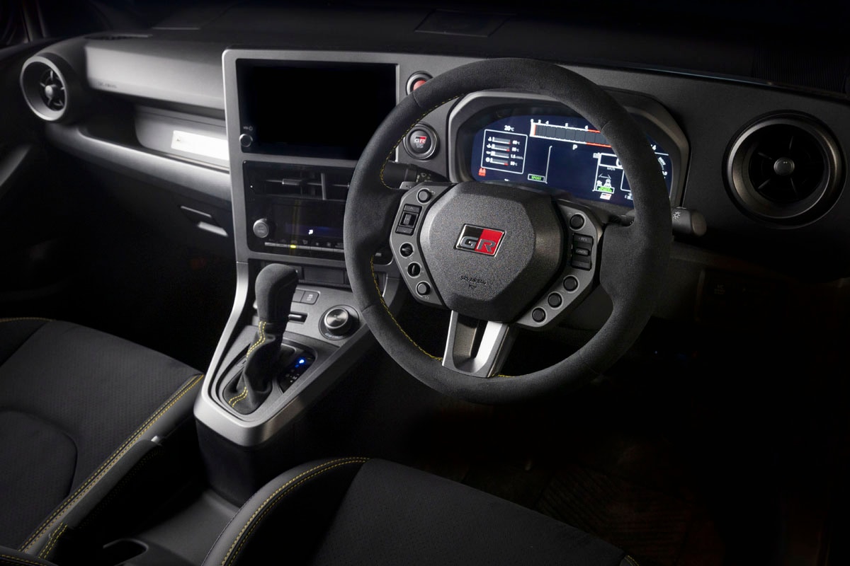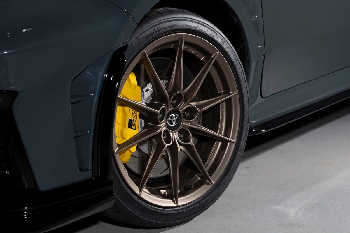 ボディカラーはGRヤリスMORIZO RR専用となる「グラベルカーキ」で、ブロンズ色のホイール装着される。ブレーキキャリパーのほか、インテリアのステッチはモリゾウのシグネチャーカラーであるイエローに統一。スエード表皮で仕立てた専用の小径ステアリングホイールが組み合わされている。
