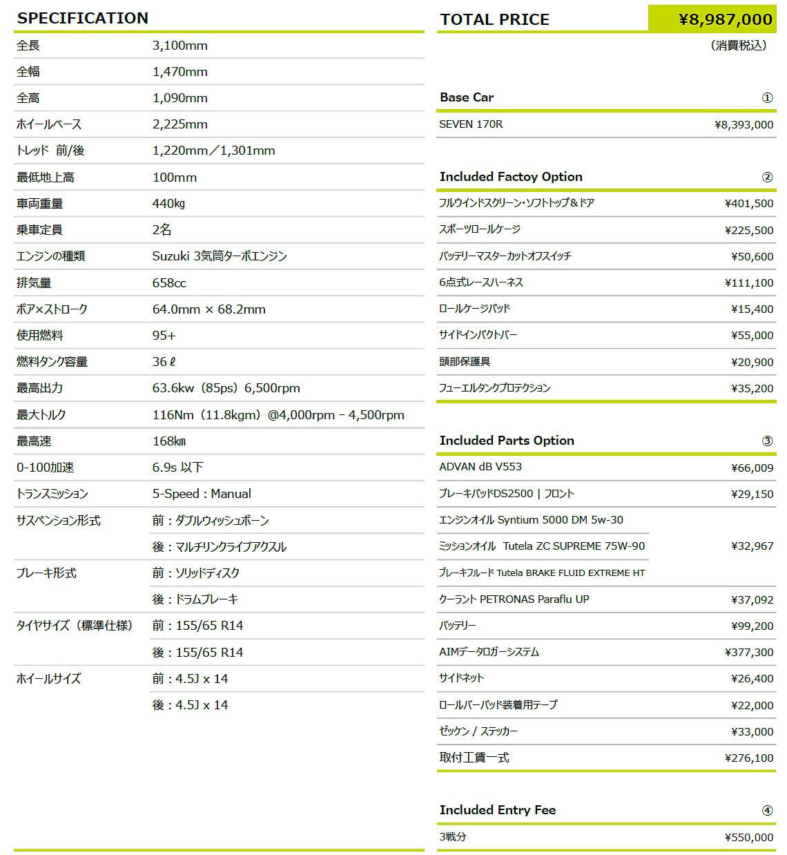セブン 170 CUP:898万7000円(レースエントリー費用含む)