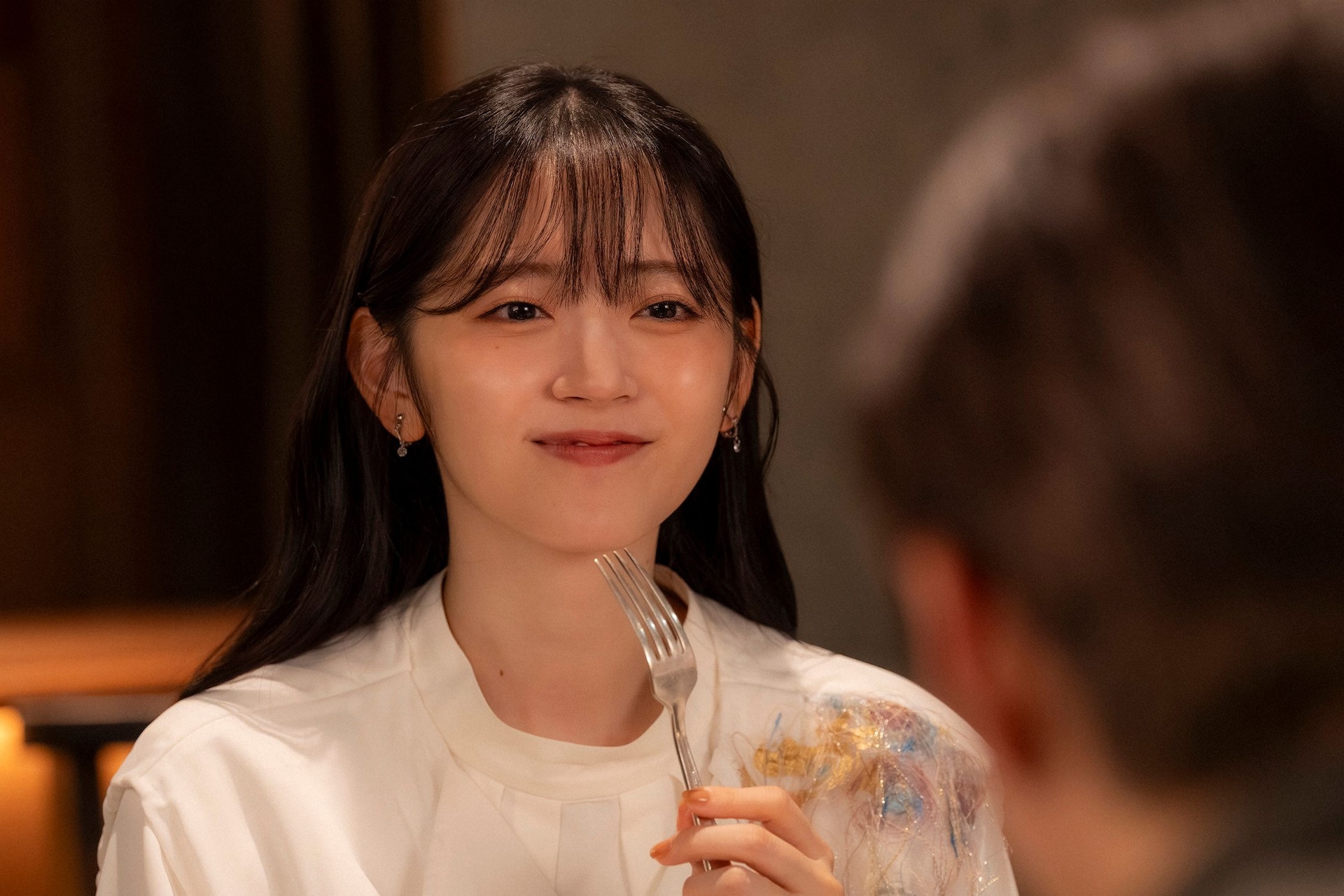 (C)「推しが上司になりまして フルスロットル」製作委員会旬(八木勇征)とのディナーで満面の笑顔を見せる愛衣(鈴木愛理)