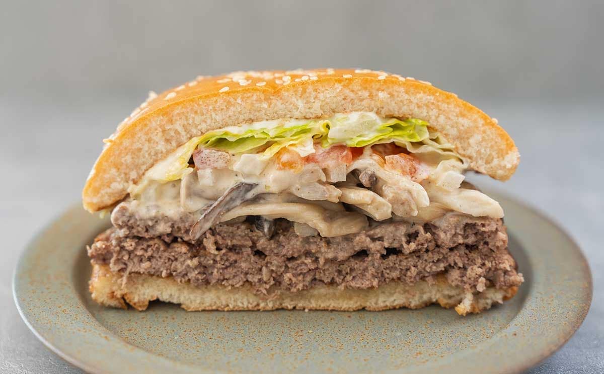 バンズのあいだには、100%ビーフパティ2枚と、ローストした2種類のマッシュルーム、エリンギ、ぶなしめじの4種のきのこ、レタス、トマト、オニオン、特製サワークリームオニオンソース、マヨソースが入っています。