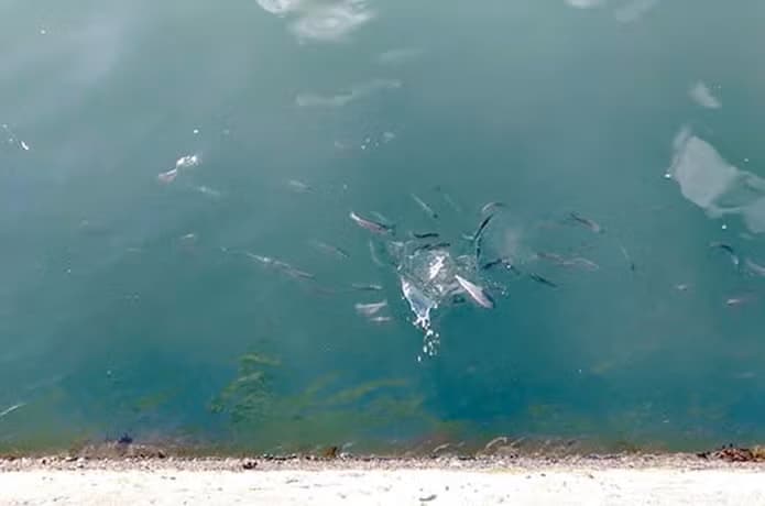 堤防に着いたら、まずは足元に餌を落としてみましょう。