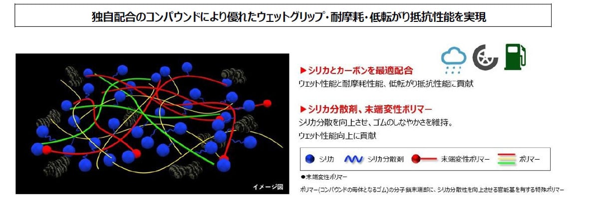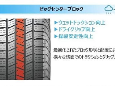 新たに「ビッグセンターブロック」や「高剛性ショルダーブロック」などを投入した専用トレッドパターンを開発するとともに、独自配合技術によりウェットグリップ性能、耐摩耗性能、低燃費性能を高次元でバランスさせたコンパウンドを採用。
