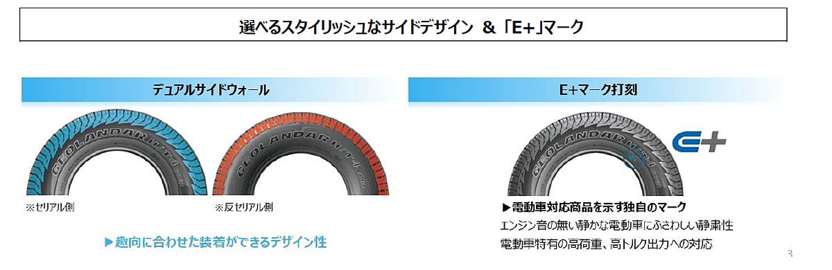 これにより、大型SUV、ピックアップトラック用タイヤに相応しい耐摩耗性能は維持しながら、ハイウェイテレーンタイヤに求められるウェットグリップ性能などの安全性や快適性能、低燃費性能をさらにレベルアップしている。また、車外通過騒音に関する国際的な業界自主基準(低車外音タイヤ)を満たす優れた静粛性も実現している。