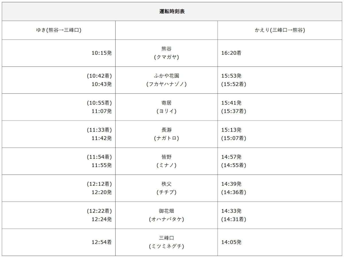 運行ダイヤは観光に便利な時間設定になっています。下り列車は、熊谷駅を10:15に出発⇒ふかや花園駅、寄居駅、長瀞駅、皆野駅、秩父駅、御花畑駅を経由し、終点の三峰口駅には12:54に到着します。
