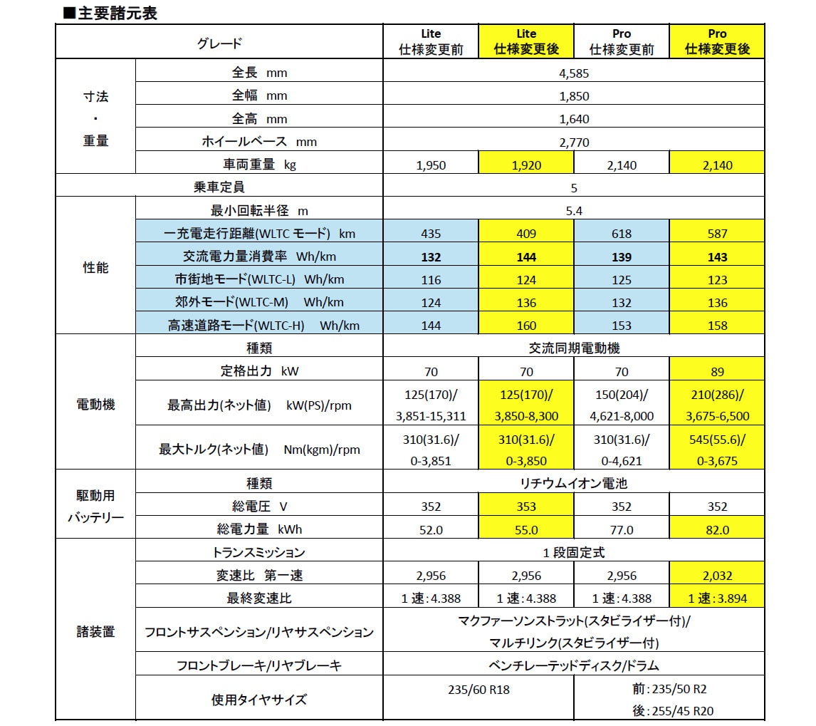 また充電は、直流入力電源が403V/250Aから403V/305Aへ向上。急速充電の最大充電電流が305Aへ向上したことにより、150kW級の充電器によって充電した際に、これまでよりも短い時間で充電を行なうことが可能となった。