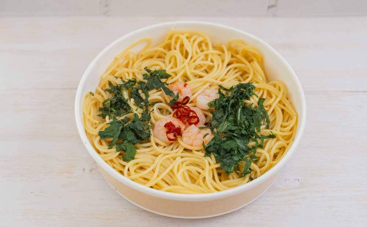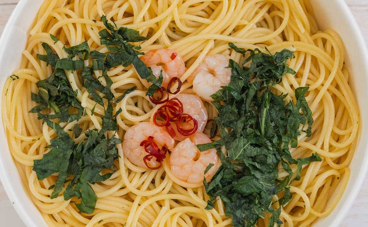 容器の底にソース(オイル?)が入っているので、パスタにしっかりと絡めて食べてみたところ、にんにくの香りと旨み、塩味が感じられて最高! にんにくのほどよい香りと唐辛子のピリッとした刺激、オイルの風味に、大葉の爽やかな香りが絶妙にマッチした、あっさりとした味わいに仕上がっています。ぷりぷり食感の海老も存在感がありますね。