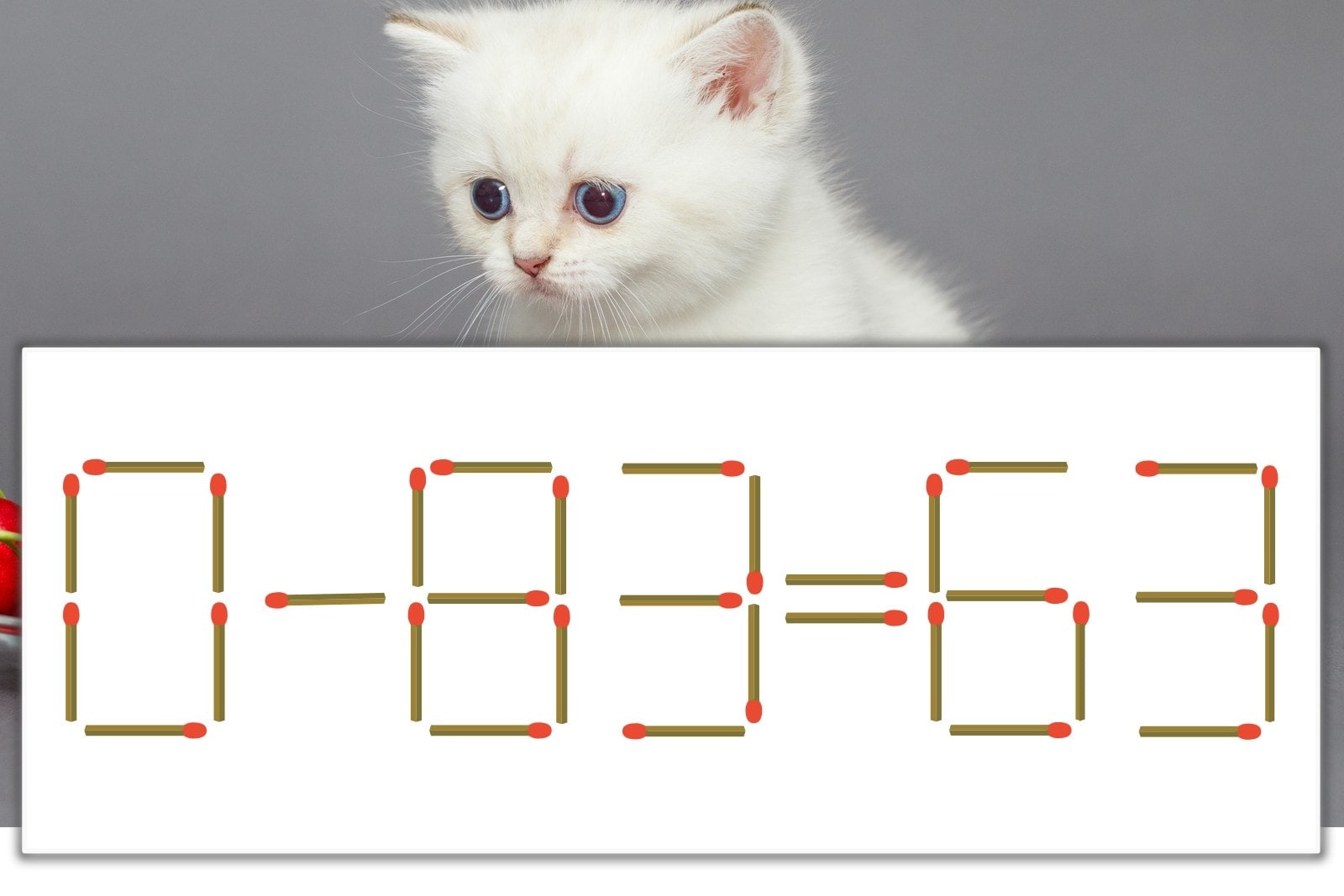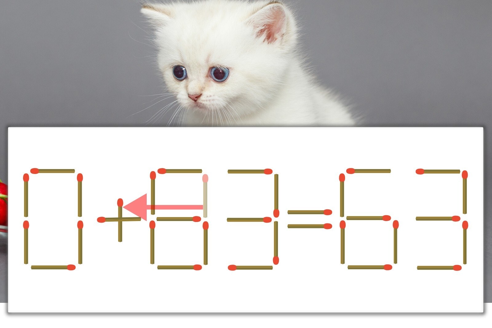 「8」を別の数字に変化させると答えが導き出せます。「8」のマッチ棒を1本移動して、「-」を「+」にしてみましょう。すると、「0+63=63」が成立します。
