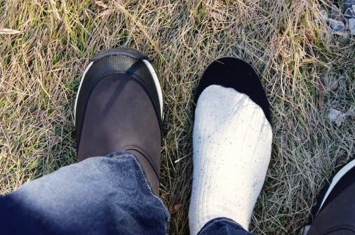 足をインソールにのせてみるとこんな感じ。足先がだいぶ余ってしまうのですが、厚手の靴下+インソールを足すことで違和感なく歩けました。