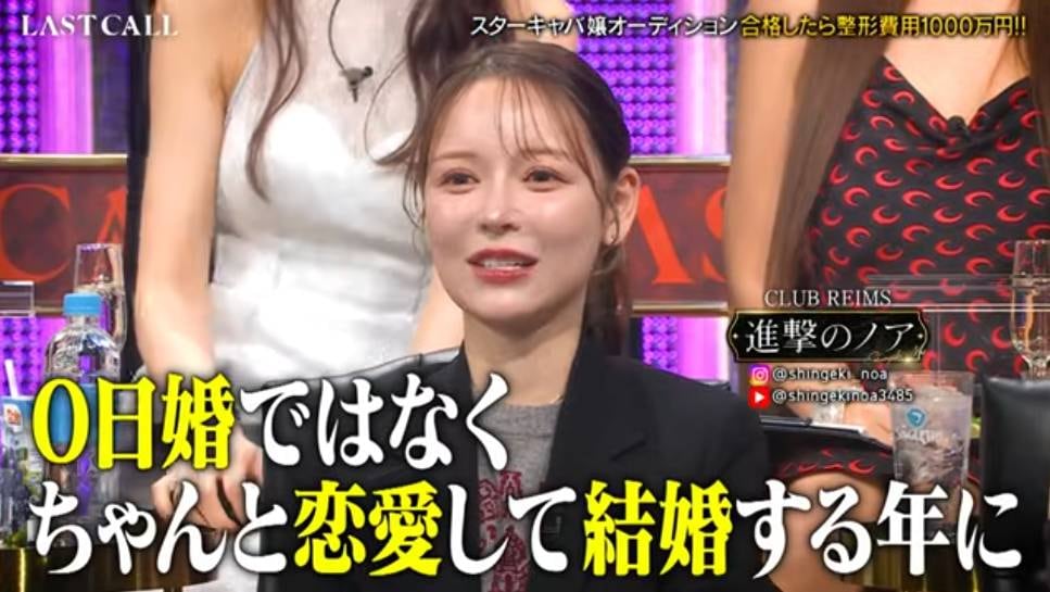 今月11日、ノアはキャバ嬢のオーディション番組「LAST CALL」(同6万人)に審査員として出演しました。オープニングトークで結婚の話題を振られると、