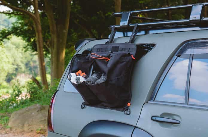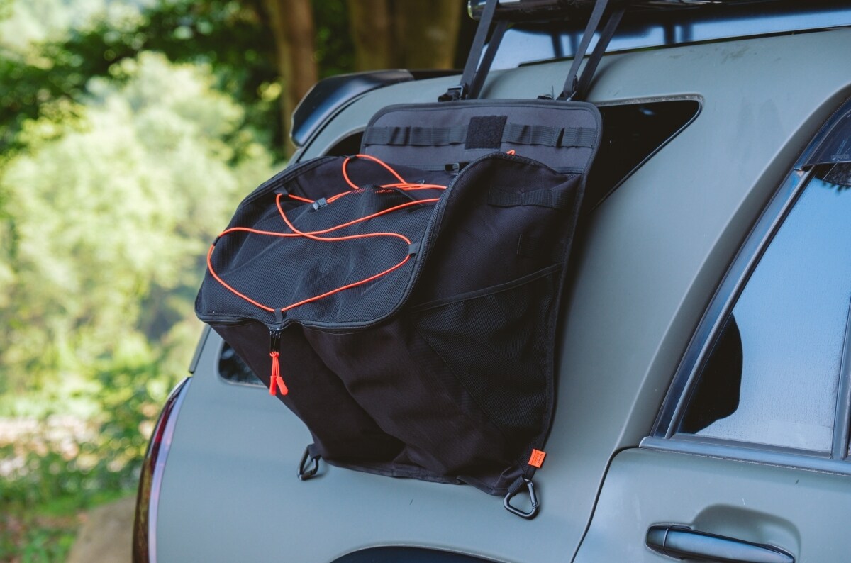 ルーフキャリアやルーフレールを利用して、車外に吊るして使うこともできます(※取り付けたままの走行は不可)。