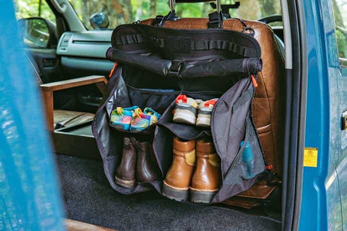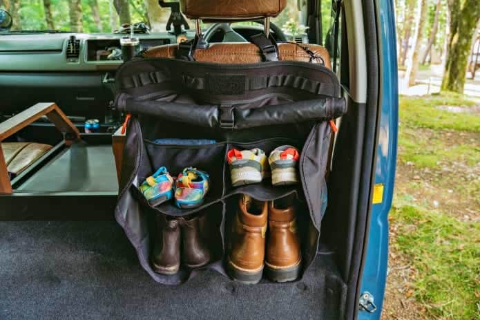 「マルチシューズラック」はヘッドレストに吊るすだけで、家族分の靴(合計4足)をすっきりまとめて収納可能。