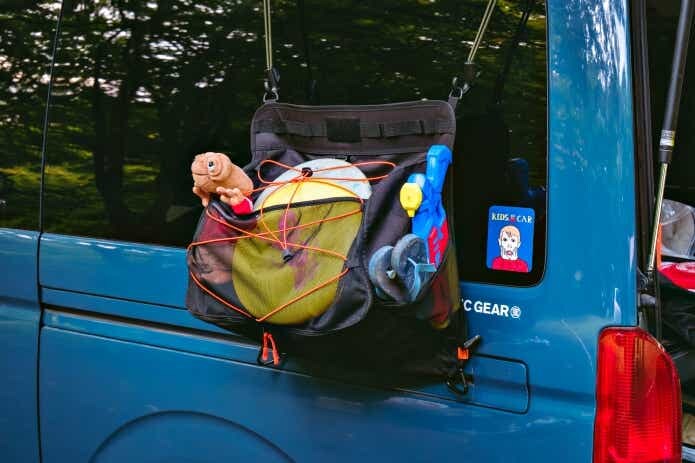 オートキャンプでは、キッチンツールや子どもの遊び道具を収納して、壁掛けラックとして使用するのも便利です。