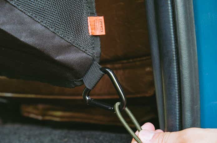 さらに下部の三角カラビナを使って、シートにロープ等でテンションをかければ密着度アップ。シートから浮かないように設置することも可能です。