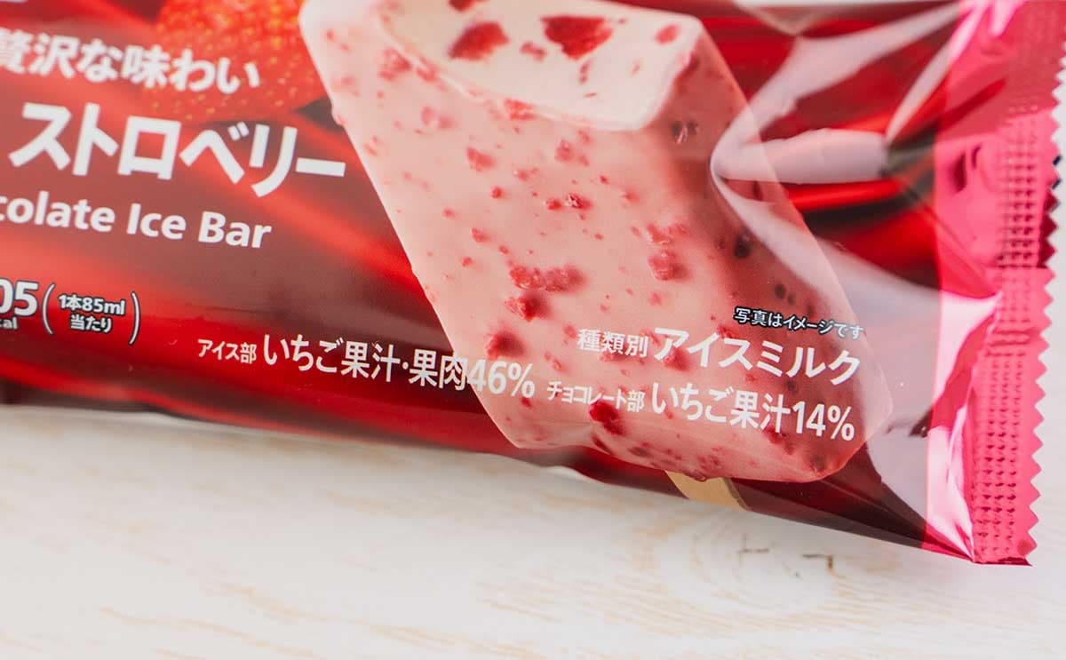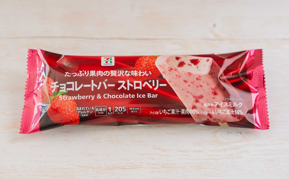 過去に何度も発売されている、セブンプレミアムの人気アイスのひとつです。2025年2月に発売された商品は、アイス部のいちご果汁・果肉は45%、チョコレート部はいちご果汁25%でした。今回の商品は、アイス部いちご果汁・果肉46%、チョコレート部いちご果汁14%となっています。