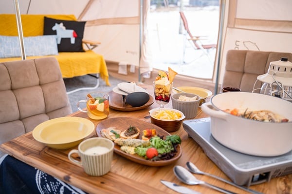 「こたキャン」は、こたつキャンプのこと。雪景色の中に張ったテントの中で、こたつに入り、身体の芯から温まるスペシャルメニューを楽しめる。冬のキャンプに興味はあっても、寒さや設備が不安だが、ここなら快適に初心者やファミリーでも気楽に楽しめる。